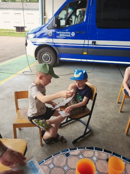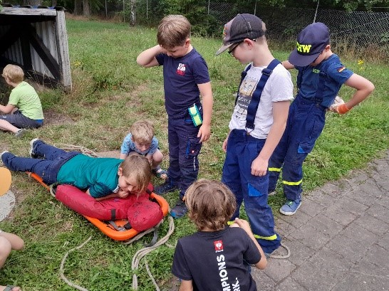 Aufgeregt kamen sie zurück und berichteten der zweiten Gruppe, der 8- bis 9-Jährigen, dass ein Verletzter in der Übungsstrecke liegt. Sofort setzte sich